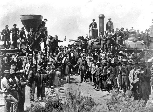 The last tie has been laid; the last rail is placed in position, and the last spike driven, which binds the Atlantic and Pacific ocean with an iron band. The electric flash has borne the tidings to the world and it now devolves upon us, the favored eye-witnesses of the momentous feat, to enter our record of the facts. Never before has this continent disclosed anything bearing comparison with it. The massive oaken-hued trains of the Central lies upon their iron path, confronted by the elegant coaches of the Union Pacific. A thousand throbbing hearts impulsively beat to the motion of the trains as the front locomotives of each Company led on majestically up to the very verge of the narrow break between the lines, where, in a few moments was to be consummated the nuptial rites uniting the gorgeous east and the imperial west of America, with the indissoluble seal of inter-oceanic commerce …The excitement of this moment of victory was intense, cheers were given for the officers of the Central, followed by cheers for the officers of the Union Pacific; cheers for the Star Spangled Banner, for the President of the United States, for the engineers and contractors and for the laborers that have done the work.(6)